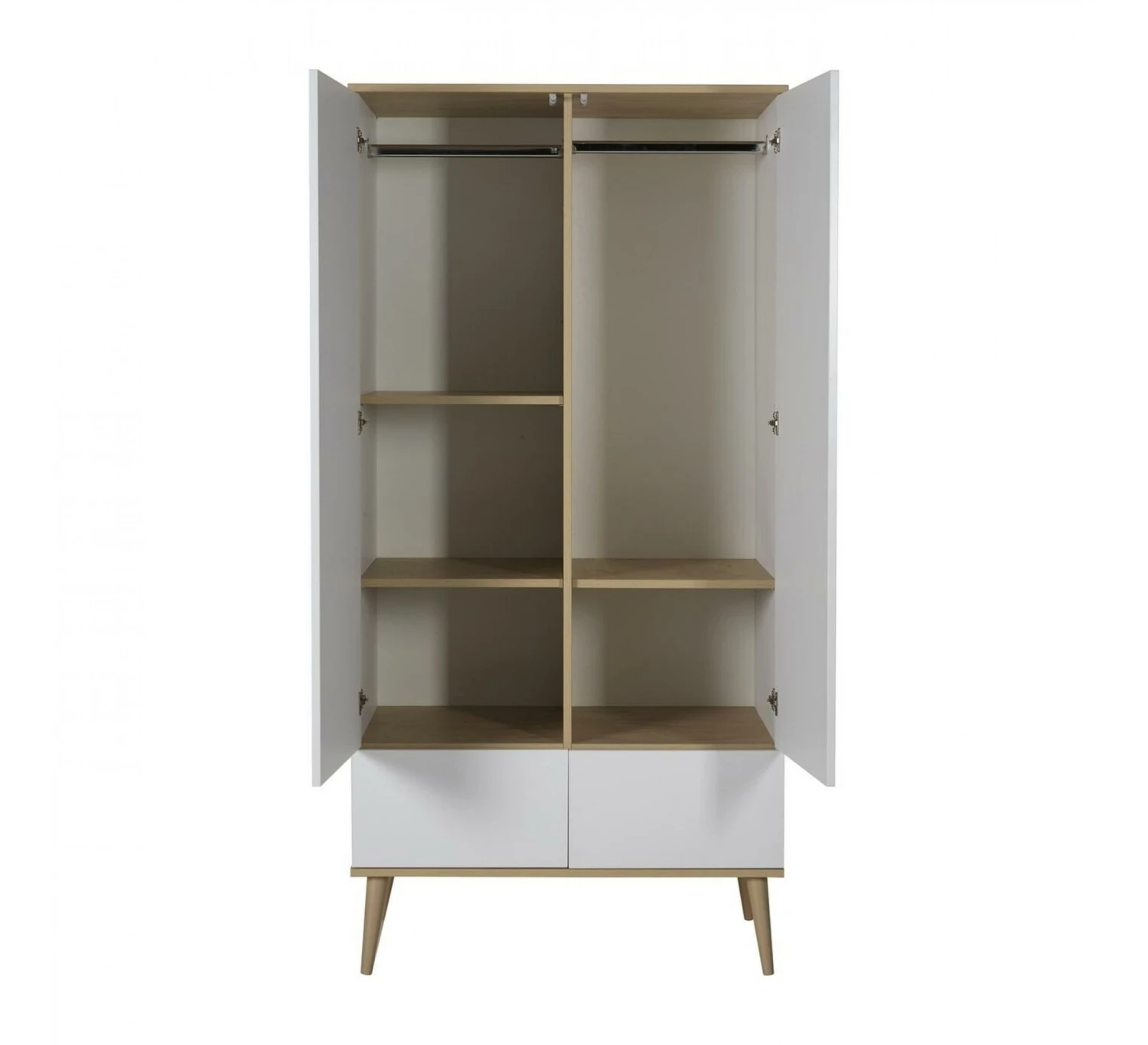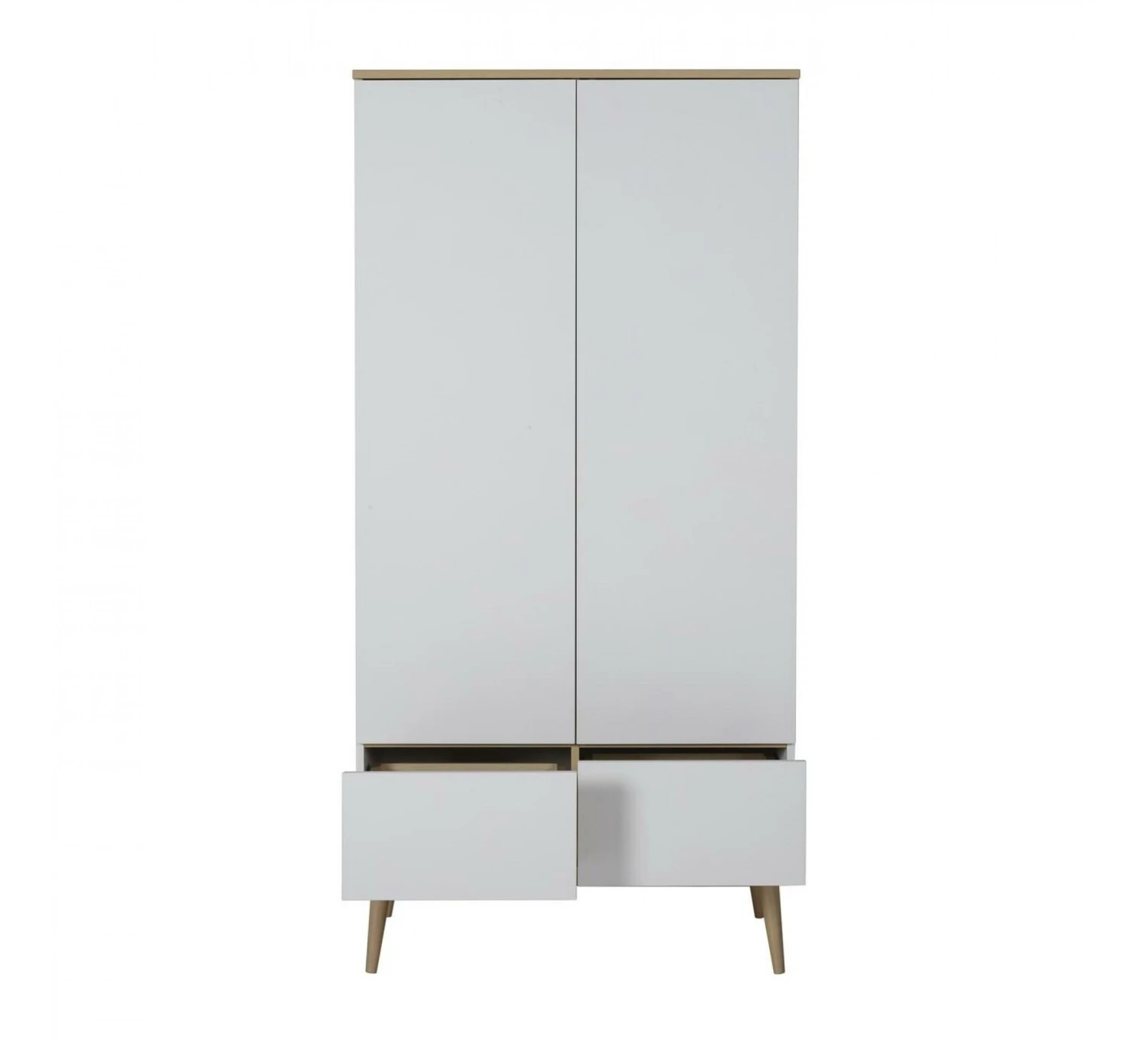 De 2-deurskast Flow van het merk Quax is ideaal voor in de babykamer. Deze ruime designkast biedt veel opbergruimte. Naast de vele ruimte achter de twee deuren beschikt de kast ook nog over twee lades om kleding of spullen in op de kunnen bergen. De kast wordt geleverd met met drie legplanken en een kledingroede. De kast is uitgevoerd met de kenmerkende ranke pootjes die de kast een mooie uitstraling geven. De kast is gemaakt van MFC en beukenhout. De kast is in verschillende kleuren verkrijgbaar. Combineer de kast met de andere meubelen uit de Flow collectie.