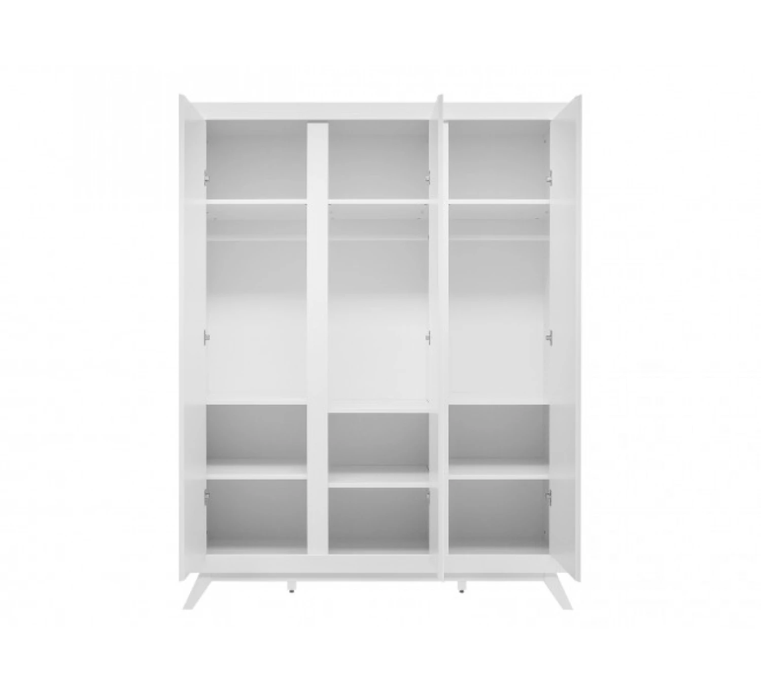 In deze royaal bemeten 3-deurskast Anne heb je voldoende ruimte om al jouw spullen in op te bergen. Het interieur bestaat uit drie vaste planken, drie in hoogte verstelbare hangroedes en zes in hoogte verstelbare legplanken. De serie Anne kenmerkt zich door de ranke schuine pootjes en greeploze deuren. De deuren zijn voorzien van subtiele horizontale groeven. De kast is afgewerkt met een dekkende witte lak op waterbasis en is kind- en milieuvriendelijk.