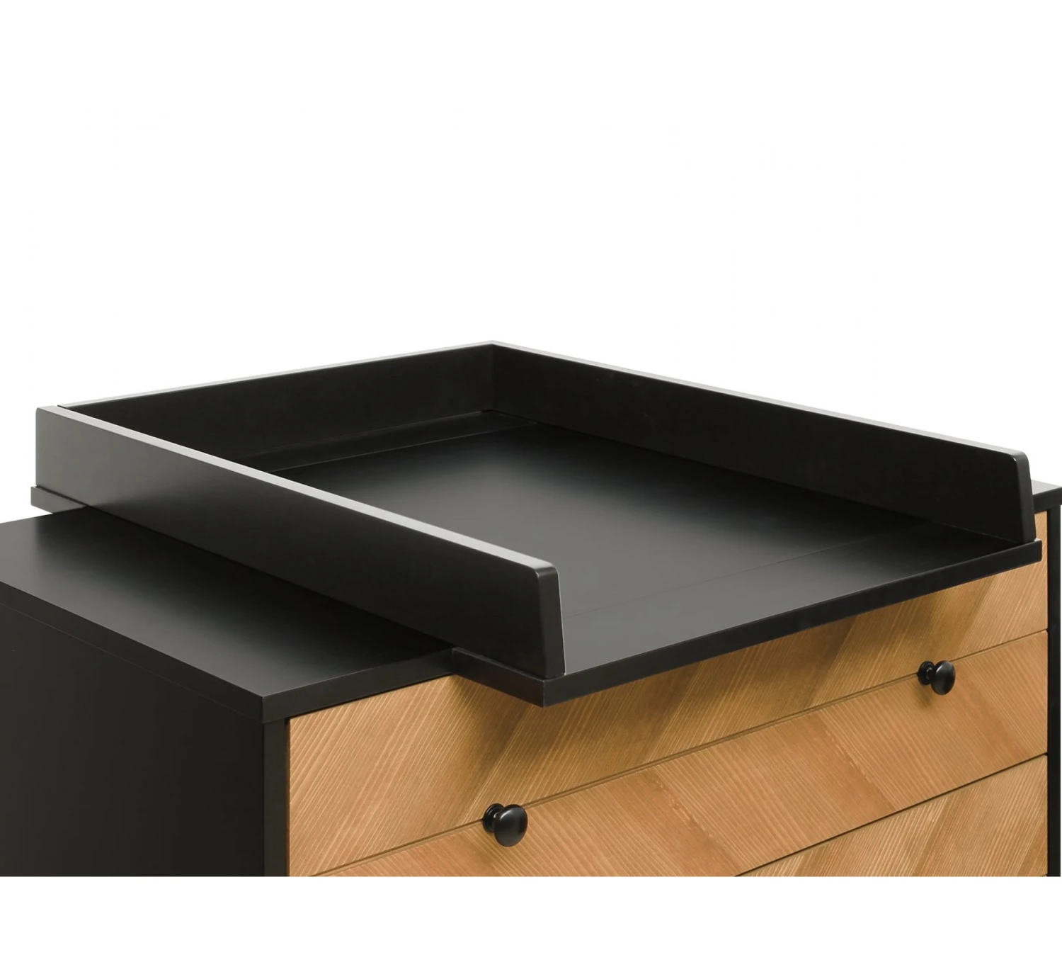 Deze barrier past op de commode Job van Bopita en is uitgevoerd in mat zwart. Het opzetstuk zorgt ervoor dat de aankleedkussenhoes niet kan verschuiven tijdens het verschonen.