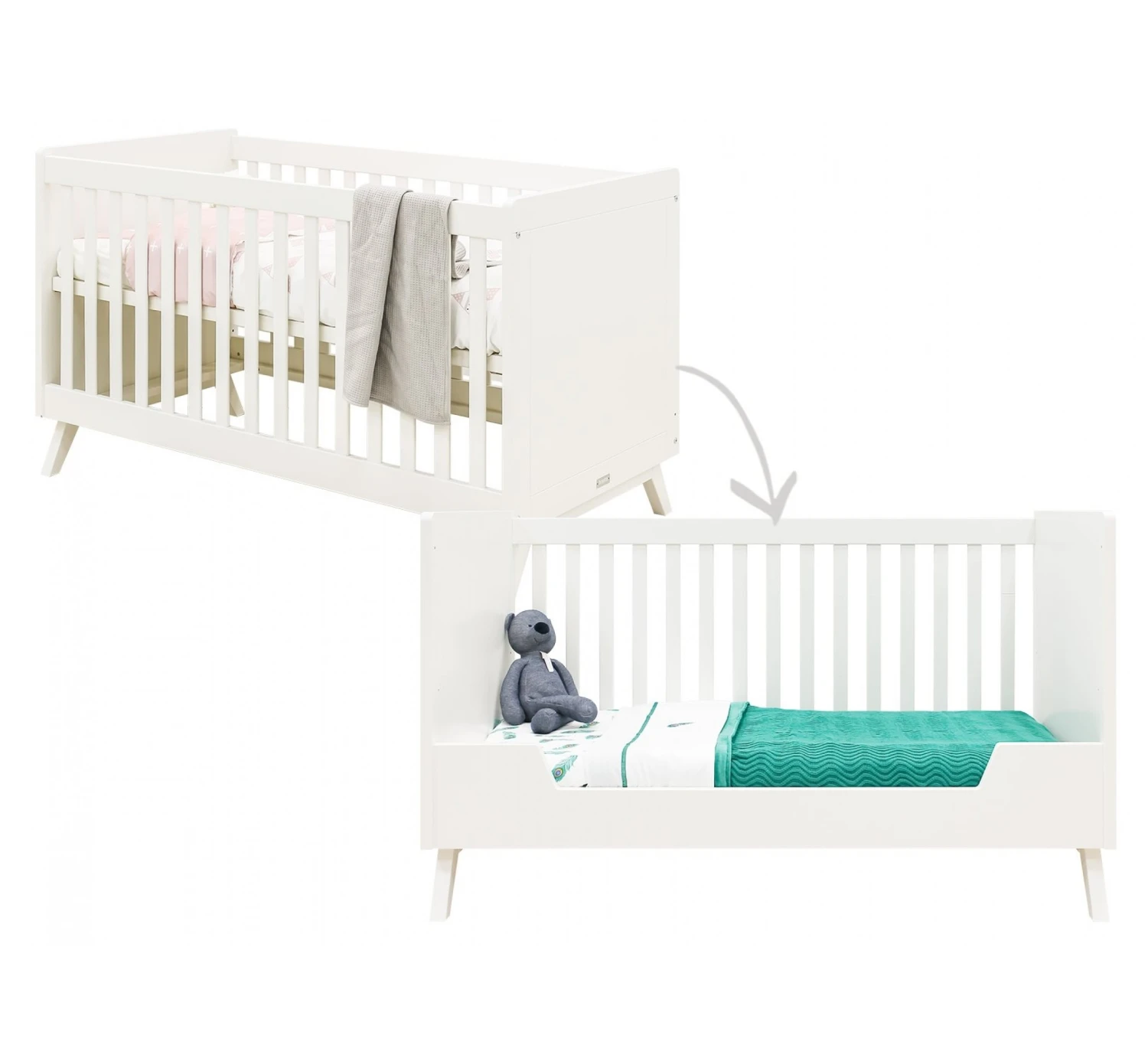 Dit babybed (70 x 140 cm) van de serie Retro is om te bouwen van een babybed met spijlen, naar een peuter bedbank zodat de kleine zelf kan in- en uitstappen en hieraan kan wennen. Bedbodem, spijlenrek en lage zijde voor de bedbank worden standaard meegeleverd. Bedbodem van het spijlenbed is verstelbaar in hoogte. De maat, 70 x 140 cm, is hetzelfde voor beide bedden waardoor 1 matras volstaat. Omdat je dit bed kan ombouwen heb je er lang plezier van! Let op: dit bed is niet om te bouwen naar een cotbed variant, er is altijd 1 spijlenzijde aanwezig.