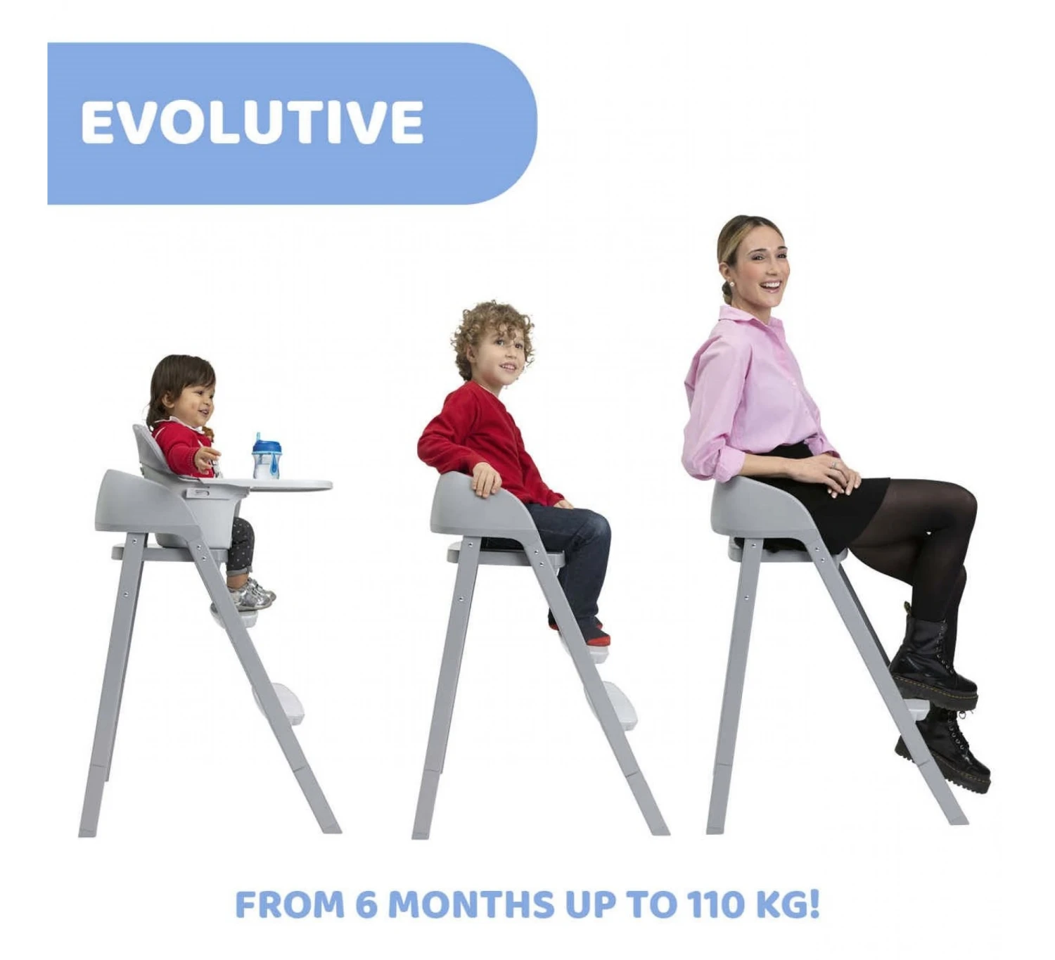 De evolutionaire kinderstoel van Chicco heeft 3 configuraties: hoge stoel, kinderstoel en stoel voor volwassenen. Hij is te gebruiken vanaf 6 maanden en kan tot 110 kg dragen! Zo kunnen kinderen met de rest van het gezin aan tafel zitten.