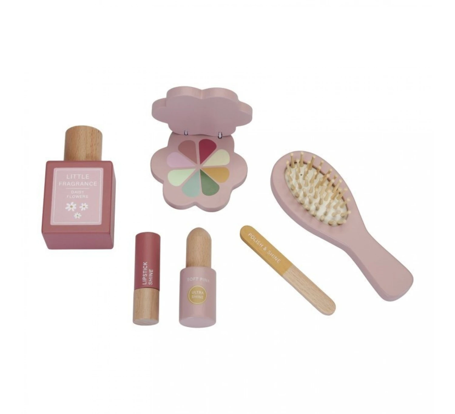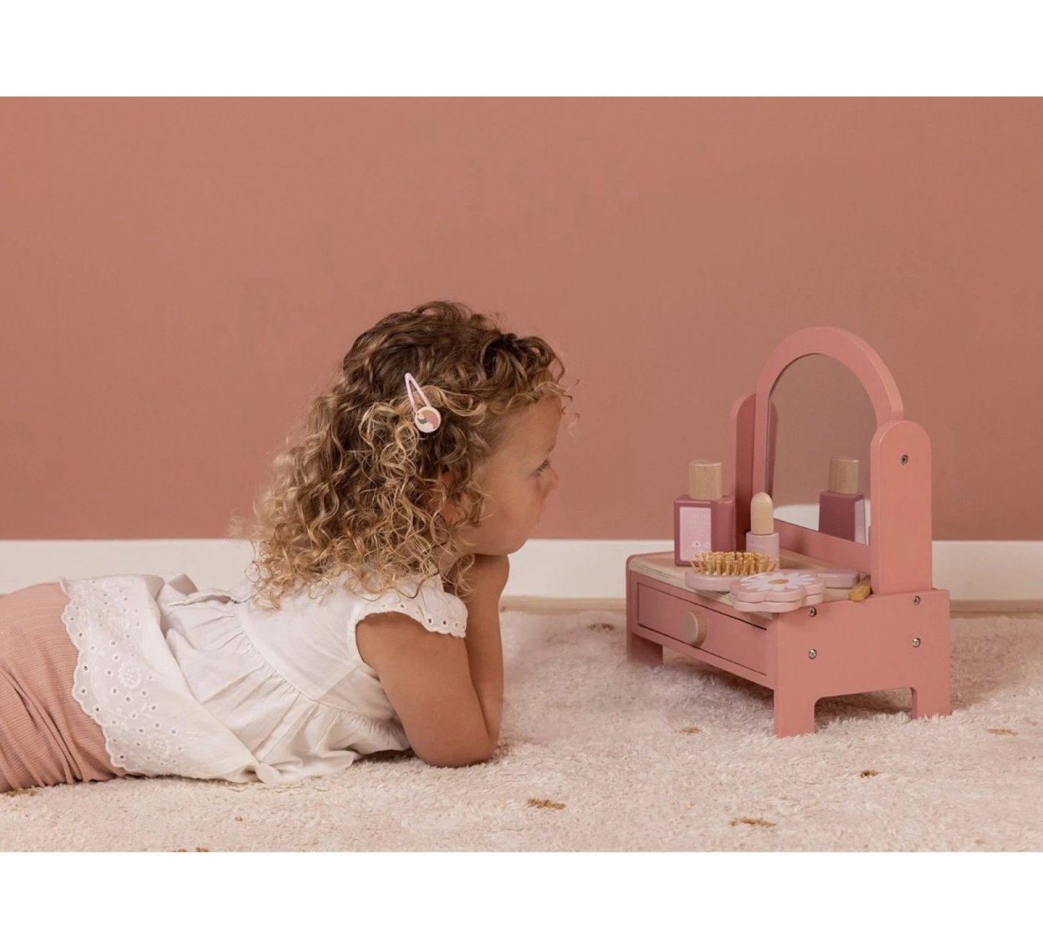 Deze roze houten kaptafel van het merk Little Dutch stimuleert kinderen voor een fantasierijk spel en zorgt voor eindeloos veel speelplezier. De kaptafel beschikt over een draaiende spiegel en 6 houten schoonheidsproducten, zoals een haarborstel, lippenstift, parfum, oogschaduw, nagelvijl en nagellak. De kaptafel heeft ook een opberglade om haarbanden, elastiekjes en speldjes (niet inbegrepen) in te bewaren.