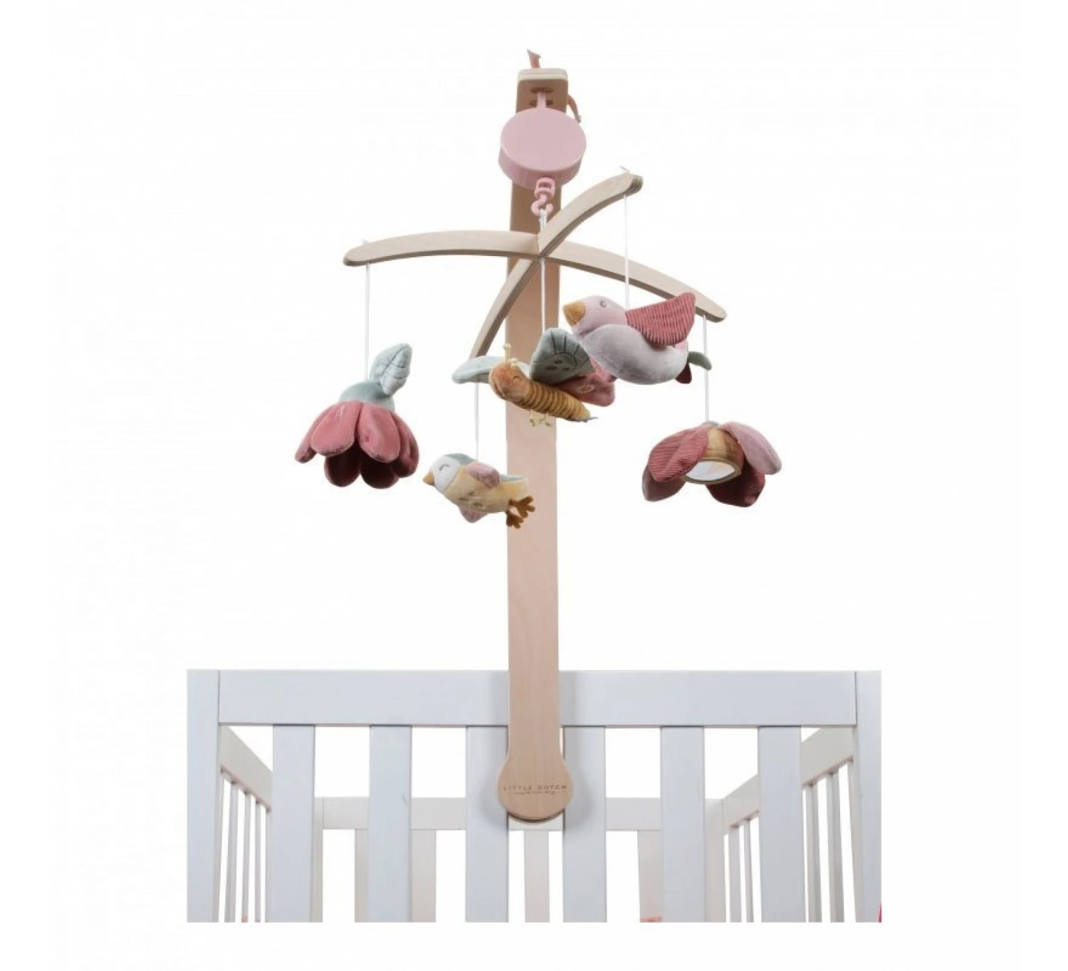Deze mooie houten Little Dutch muziekmobiel werkt rustgevend voor baby’s dankzij het lieve slaapliedje. Aan de mobiel hangen vijf speeltjes uit de Flowers & Butterflies collectie: twee bloemetjes, het kleine vogeltje Olivia, Abby de mus en Lily de vlinder. Baby’s kijken graag naar de beweging van deze speeltjes, wat hun visuele ontwikkeling stimuleert. De muziekmobiel is geschikt vanaf de geboorte en eenvoudig te bevestigen aan het kinderbed of de box.