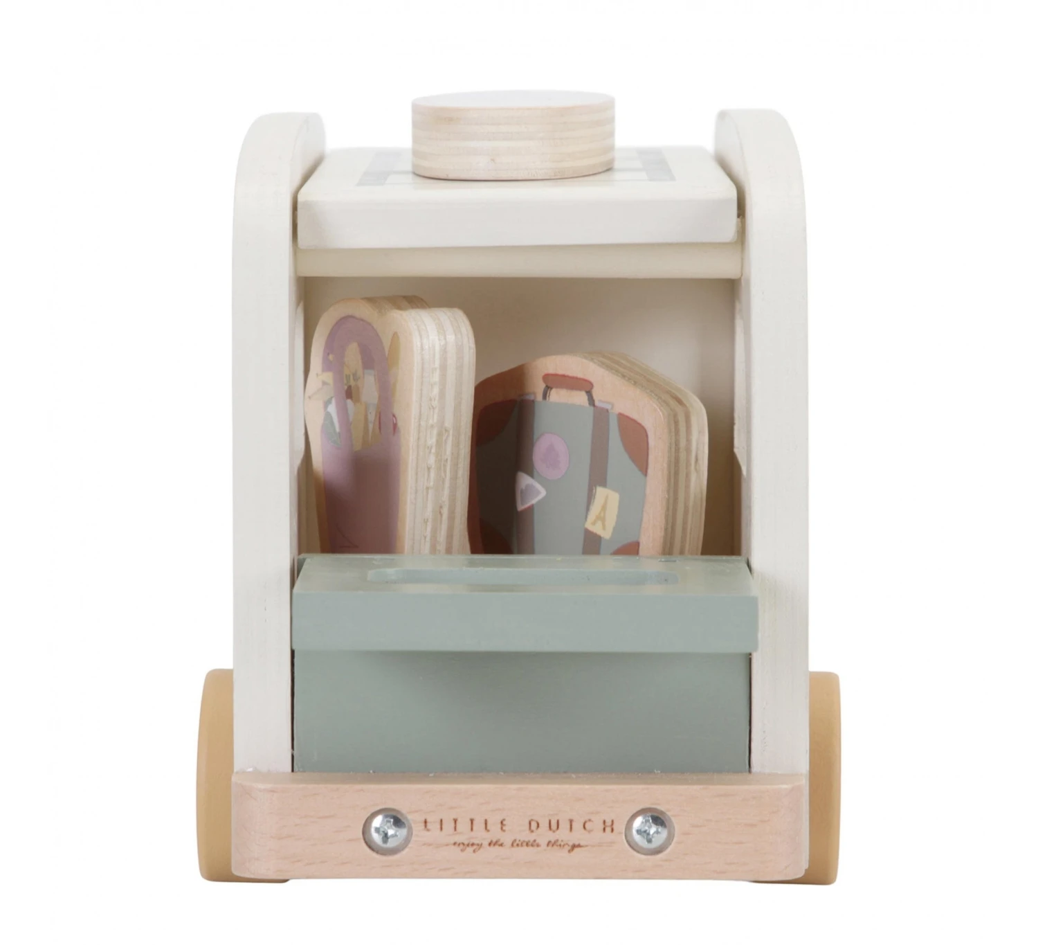 Laten we op een avontuur gaan! Stap in de camper en maak je klaar voor een dagje strand of een uitstapje met de familie. Vergeet je koffer, strandtas en surfplank niet mee te nemen! Het dakje van deze houten vintage camper kun je er af halen zodat de 4 houten poppetjes er makkelijk in passen. De achterklep kan open om de bagage achterin de camper op te bergen. Dit complete speelsetje stimuleert fantasierijke spel en kan worden uitgebreid met de andere sets van het poppenhuis.