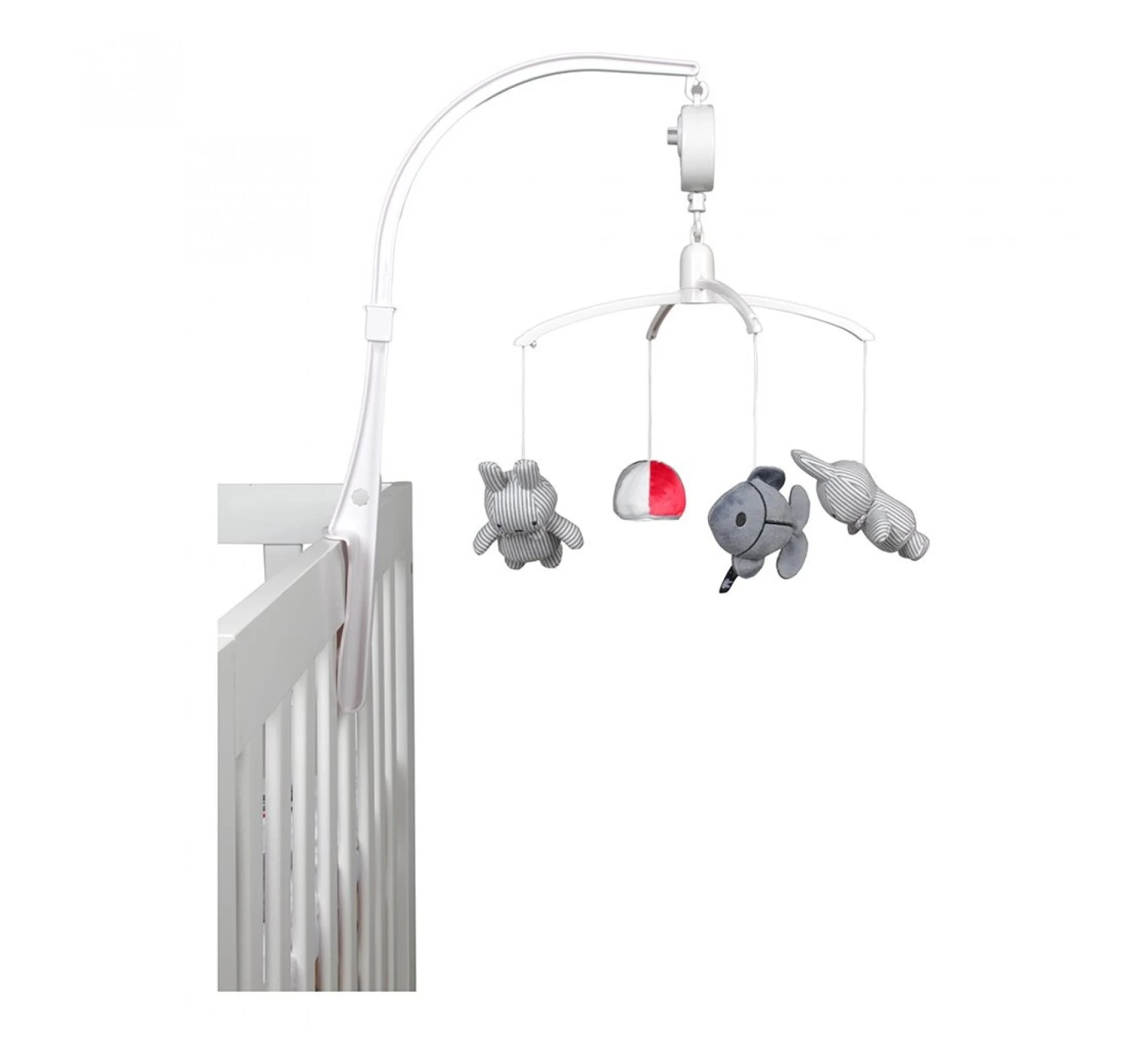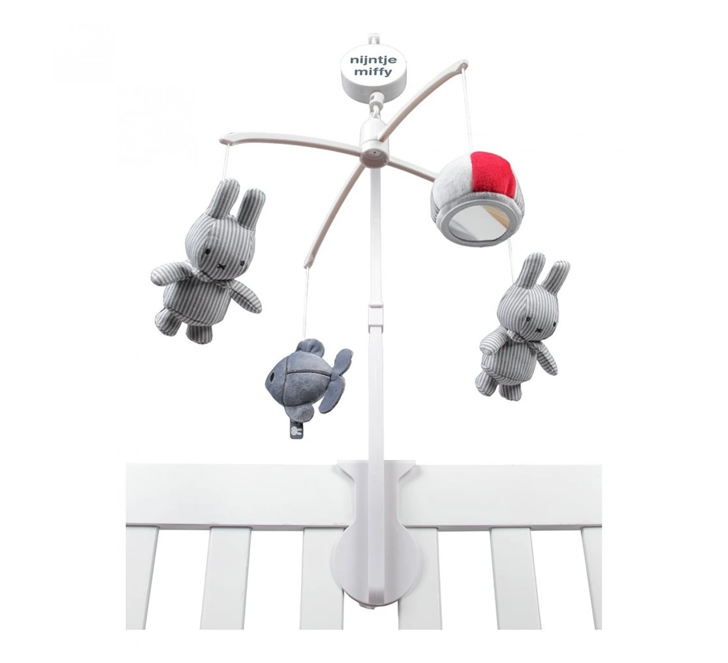 De muziekmobiel van Nijntje is eenvoudig te bevestigen aan de box. Het heeft één melodie: Brahms Lullaby. Aan de mobiel hangen vier speeltjes: twee konijntjes, een balletje met spiegel en visje. Een muziekmobiel werkt rustgevend voor de baby en leert je kleintje om te leren kijken en volgen.