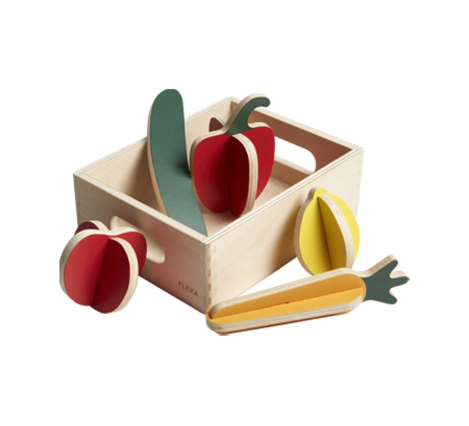Vitamientjes zijn je vriendjes. Al bevatten deze houten groentenoorten weinig gezonde voedingsstoffen, ze zijn voor je kindje natuurlijk ontzettend leuk om te verkopen in het winkeltje van Flexa. Deze groentenset bestaat uit acht onderdelen waaronder de houten kist, een wortel, een tomaat, een paprika, een citroen en een komkommer. Deze set is gemaakt van berkenhout en multiplex.