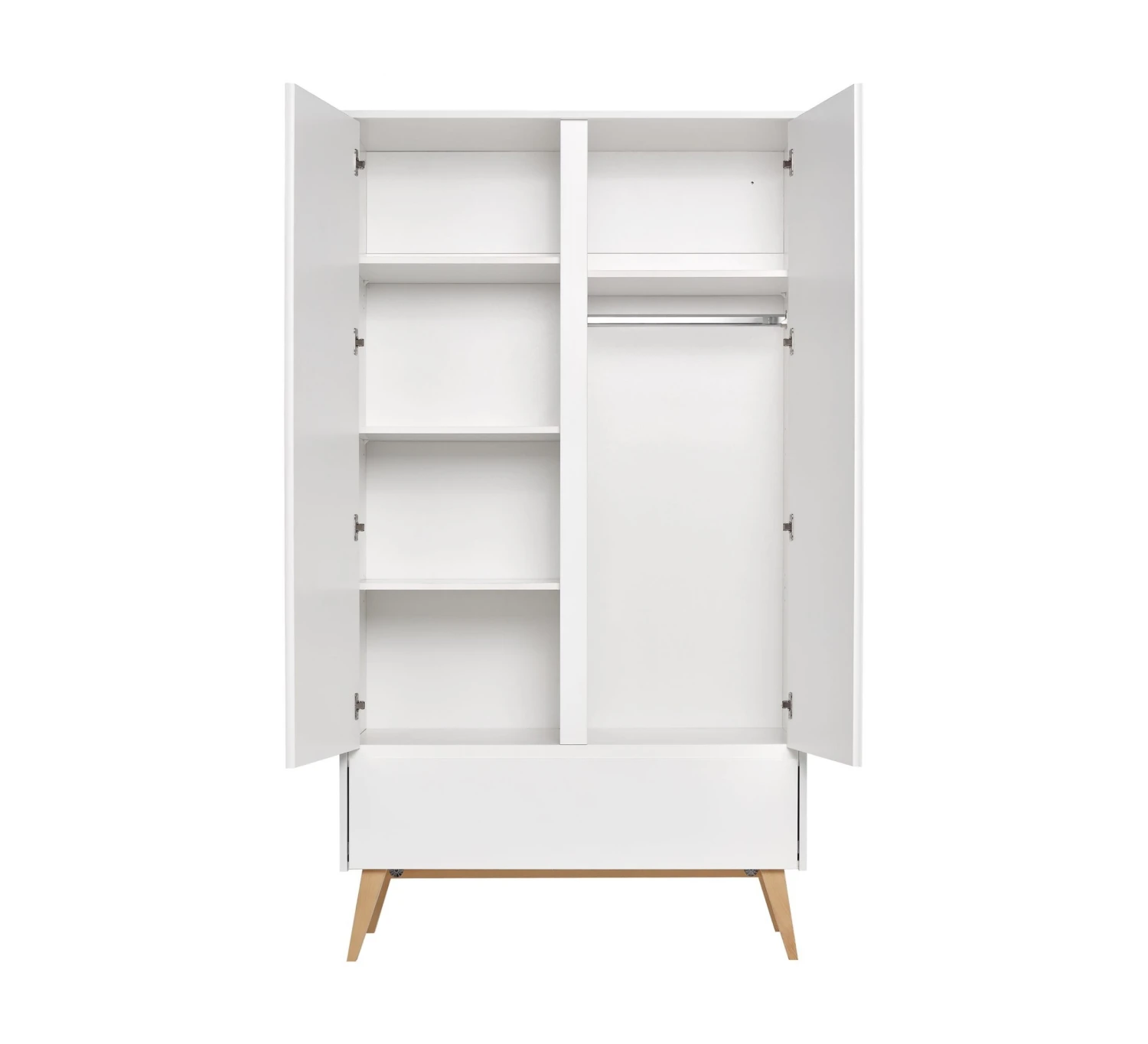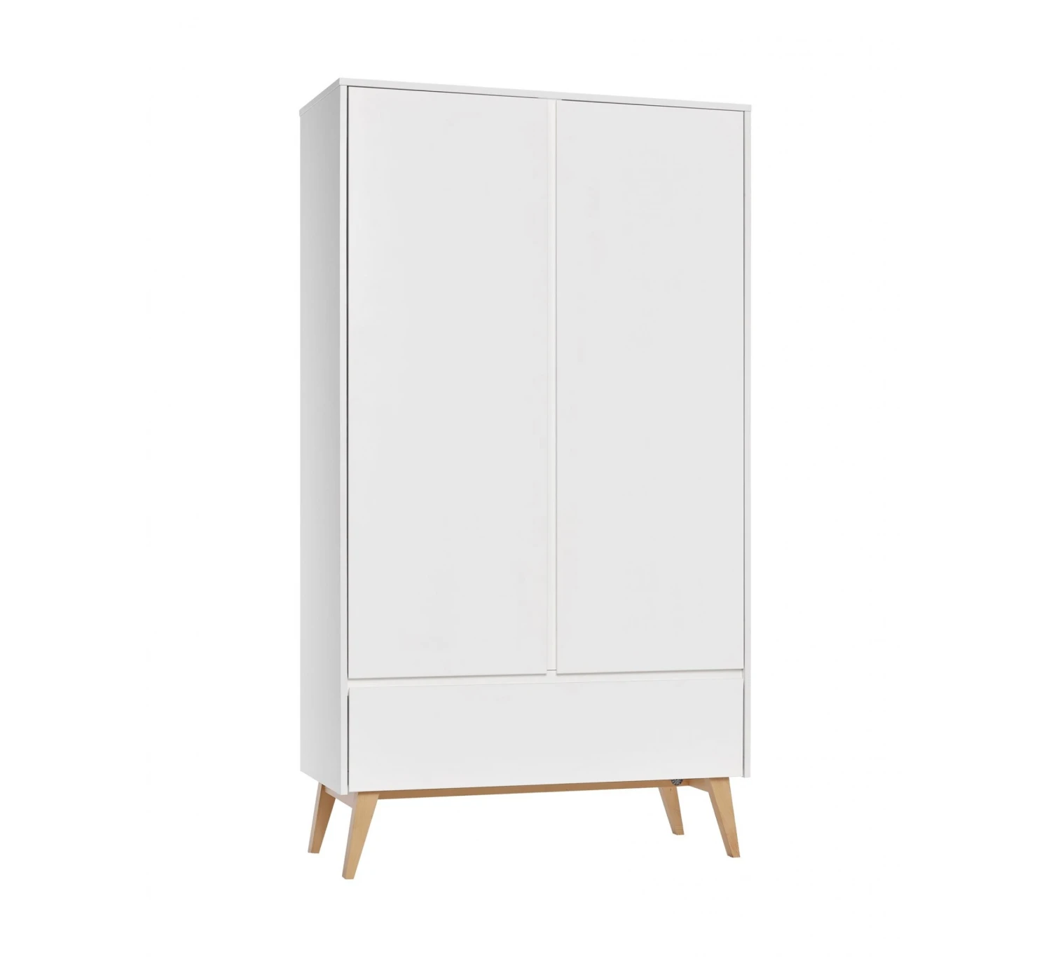 Als je een baby krijgt wordt je overspoeld met leuke kleertjes en spulletjes, maar waar laat je het allemaal? De Pinio Swing 2-deurskast biedt daarvoor de oplossing. Achter de twee deuren en de lade gaat namelijk een hoop opbergruimte schuil. De kast wordt geleverd met een hangroede en vier legplanken, zodat je de kast goed kunt indelen. De stijlvolle ranke poten zorgen voor een mooie uitstraling die in iedere babykamer tot zijn recht komt.